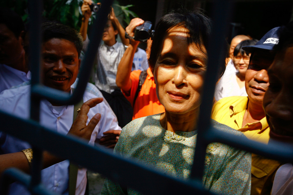 Myanmar’s pro-democracy leader Aung San Suu Kyi (center) was released after serving seven years under house arrest. (REUTERS/Stringer)