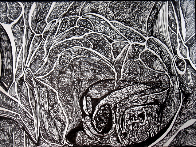 I found an ancient receipt with all the printing worn off among the sedimentary layers in my sweatshirt pocket and saw that it had an interesting pattern crumpled into it. It also felt like fine tissue drawing paper. So I started drawing on it with a regular cheap ball point. When I was finished with that I glued it on to a piece of cardboard, from some packaging, that had some parallel lines printed on it and expanded the drawing. I love using materials that come into my hands and letting the creative process take its course.